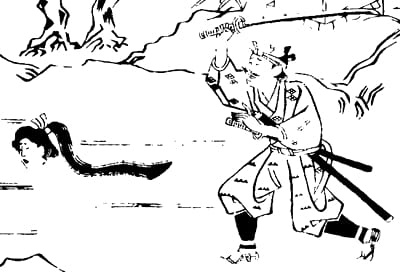 In a story from the 1663 Japanese horror collection Sorori Monogatari (曾呂利物語), in the amusingly titled chapter, "A Woman's Wild Thoughts Wandering Around," a man traveling alone on a dark and creepy road mistakenly thinks that he has spotted a chicken in the bushes. To his abject terror, he realizes that he is in fact looking at the disembodied and horrifically agile floating head, or nukekubi, of a woman.