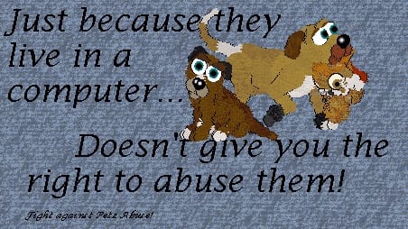 While anti-Petz abuse advocates were aware that their virtual pets weren't real, from their point of view, this was largely immaterial: as one widely-used banner pointed out: "Just because they live in a computer...doesn't give you the right to abuse them."