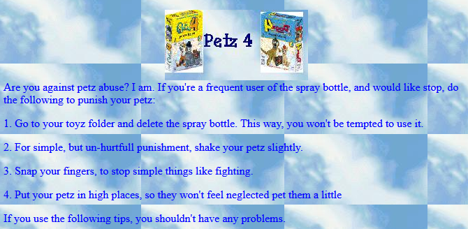 Many of these Petz websites hosted pages and banners dedicated to fighting what their kid administrators believed was a genuine social problem: stopping Petz abuse.