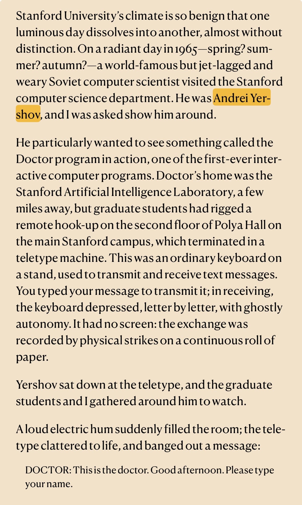 [[4]] Pamela McCorduck relates another early example of the human drive to anthropomorphize even primitive chatbots in this anecdote about the computer scientist Andrei Yershov and his interactions with the "Doctor" NLP program in 1965: