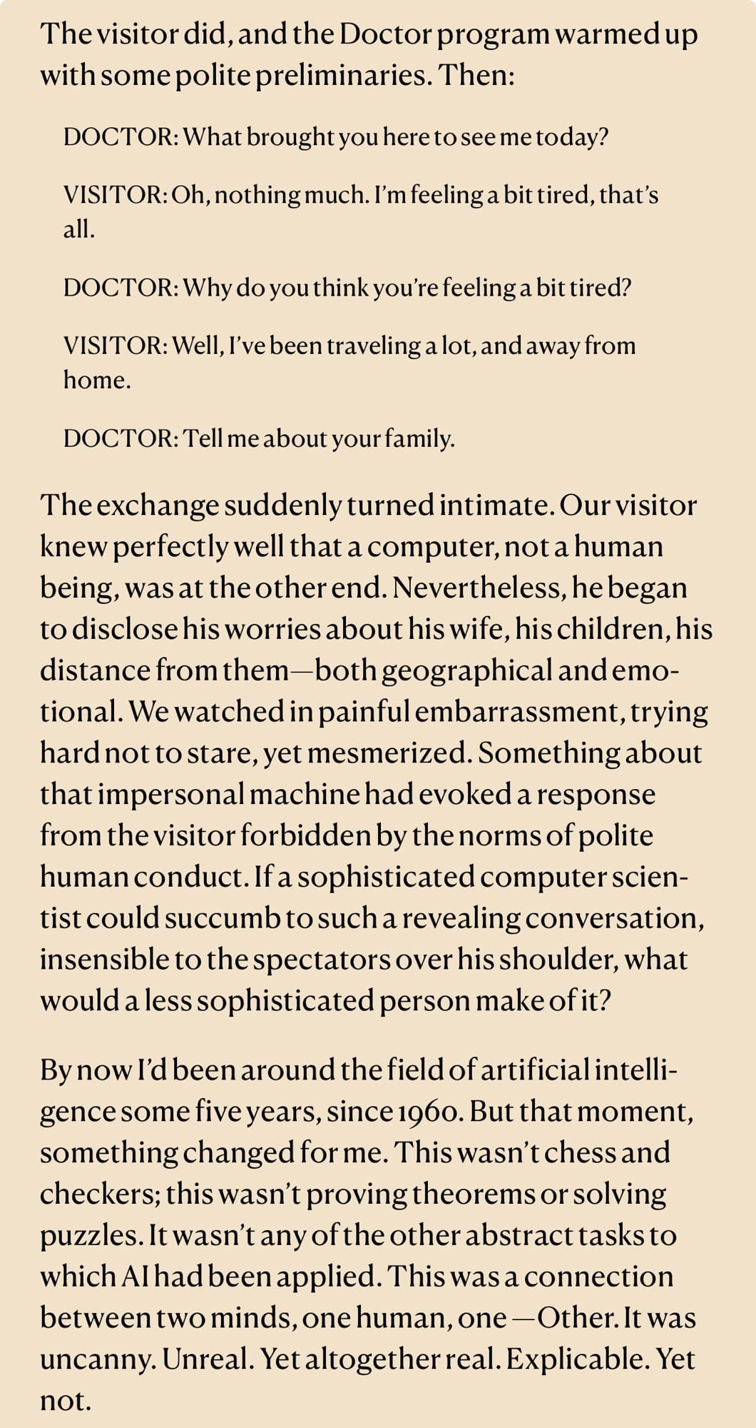 This revelation disturbed him so much that he wrote "Computer Power and Human Reason," whose core arguments include that using an AI to simulate human psychotherapy should not just be considered wrong: it should be considered an obscene use of a digital tool in a space that it does not and cannot comprehend.