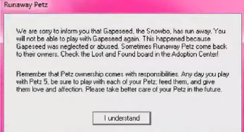 If squirted with the spray bottle enough times, or if ignored by the player for a long enough period, a given Petz internal Neglect score might reach such a point that the game would designate them as a "Runaway," freed forever from their owner's tyrannical influence. (Well, technically - it was possible to edit the Petz file directly to get them back).