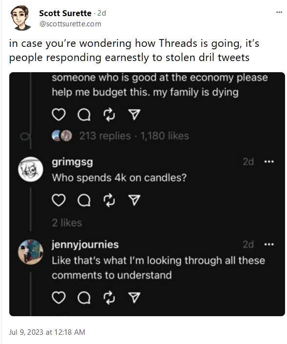 I’m also disappointed - and worried - to see so many new Threads users saying that they feel like the platform is much safer and more friendly than Twitter is. Although Threads might be better than Elon’s Chock Full Of Nazis shithole for now, I don’t see many reasons to hope that it’ll stay that way.