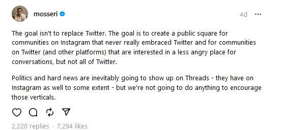 Threads chief Adam Mosseri - who ran Facebook’s News Feed back in 2016, and I think most of us remember how awesome that went - stated the other day that his service won’t be actively encouraging politics or hard news. Per Mosseri, these buzzkill, bummer topics aren’t “worth the scrutiny, negativity (let’s be honest), or integrity risks.”