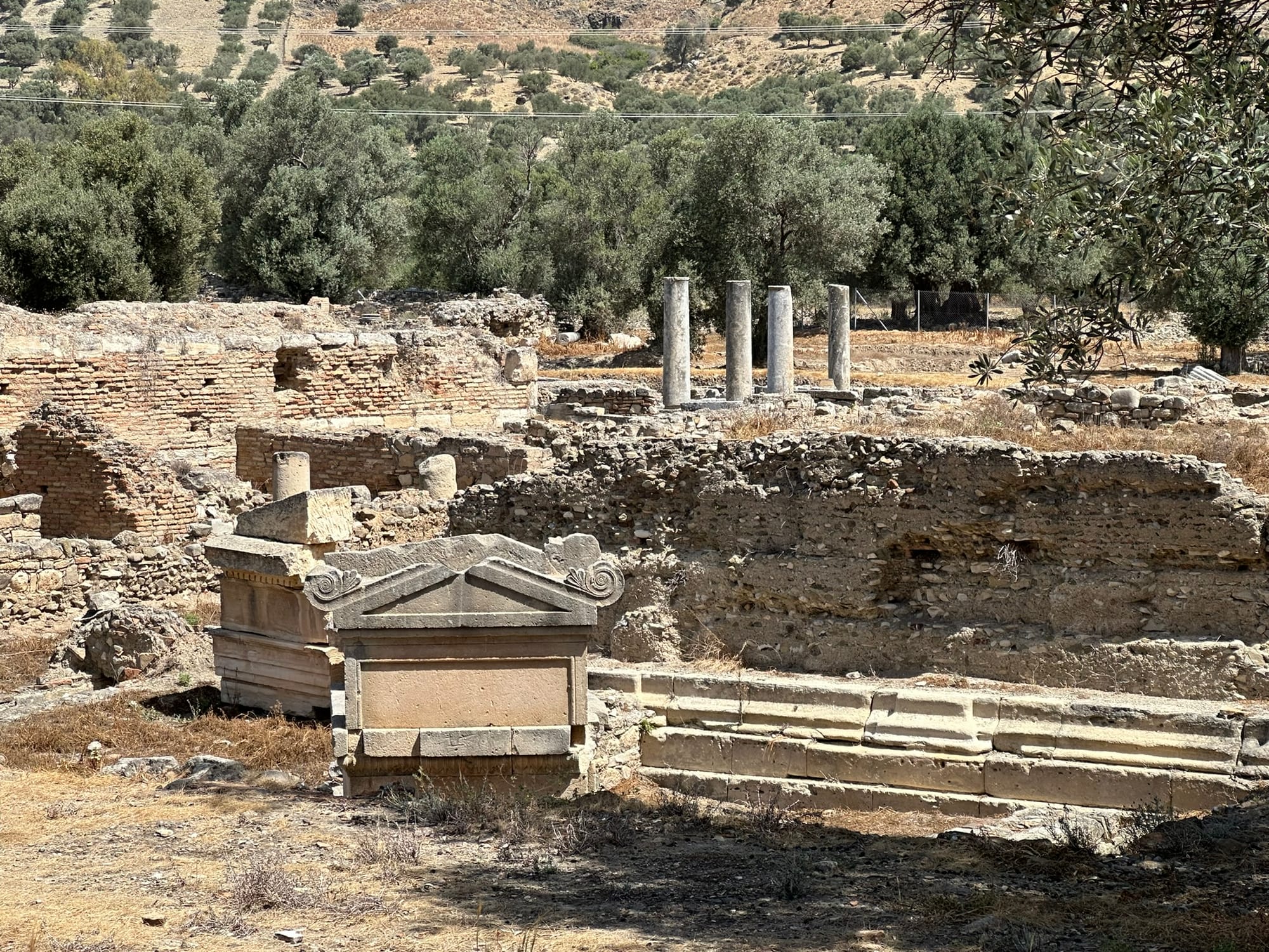 Moving onwards, I diverted to go see the ancient Roman luxury villa preserved a little ways away from the main site. The well-preserved bases of columns and an ancient Roman peristyle courtyard hint at a long-gone, luxurious lifestyle.
