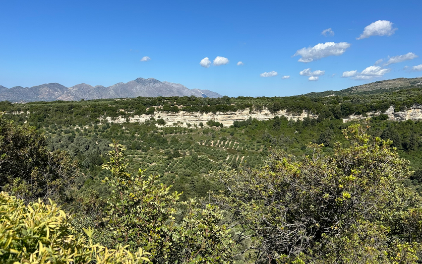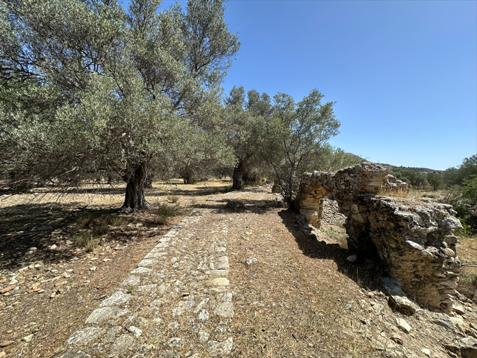 I needed to walk back to my car, and I noticed that another trail looped back down to Orthi Petra, which would prevent me from having to retrace my steps. I followed the trail through olive groves, sheep fields, and past an impressive fenced thicket of pine and cypress trees, protected from the incursions of grazing livestock: after letting myself through another goat fence and scrambling down a washed out trail into the creekbed, I was back where I'd started.
