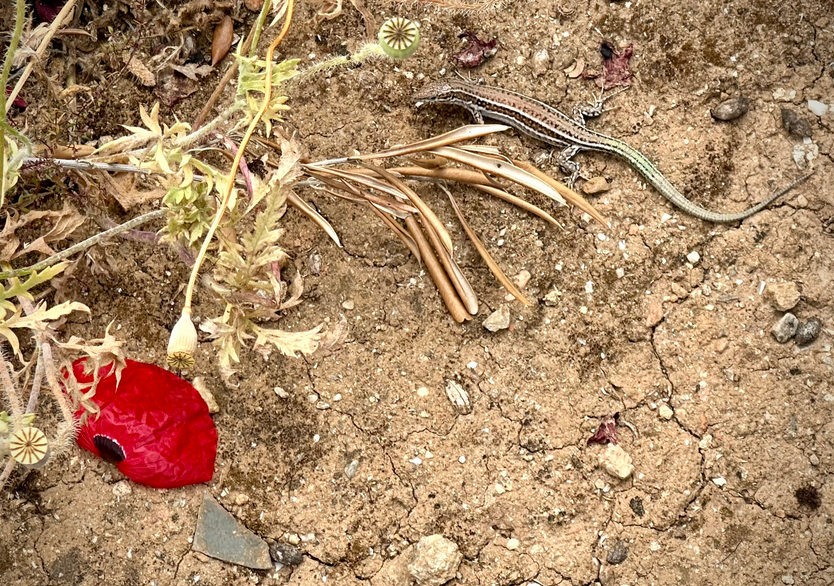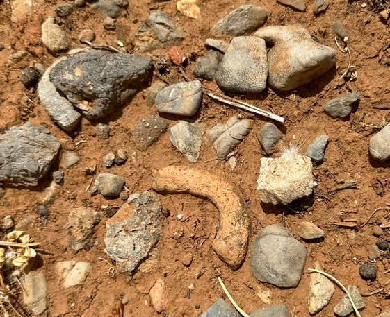 I wandered up the parched and recently partially-burned hill that overlooks Chryssolakkos for a bit, and found a number of pot shards and other ceramic remains lying in the sand. (Look and don't touch if you find these).
