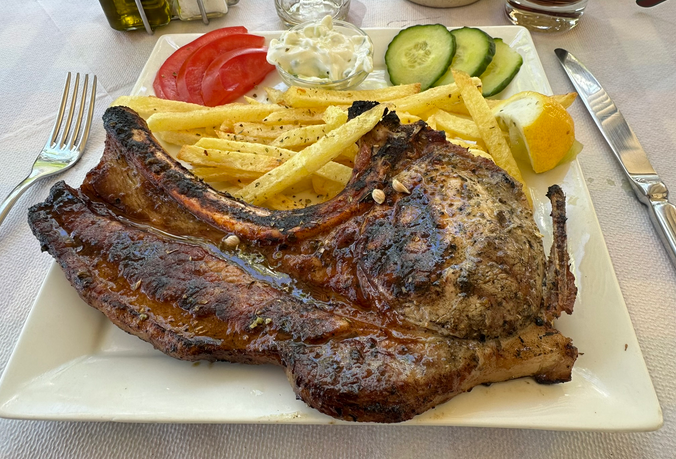 Paradosiakon (Georgios I. Sifakis) - Meat-centric Greek restaurant with a lovely outdoor courtyard in the middle of town. I enjoyed the smoked pork with honey, as well as the ultra-airy fried eggplant.