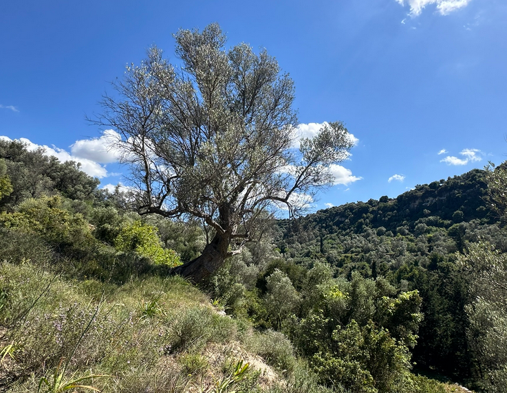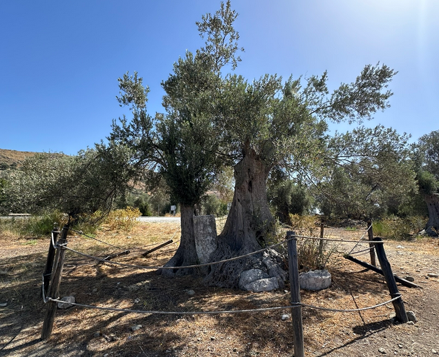Pause for a moment to consider the site's famous 1600-year old olive tree and how it engulfs an ancient marble pillar, and something-something-Ozymandis. Then proceed into the scrublands beyond: you can't really get lost, and this is an ideal place for un-directed exploring.