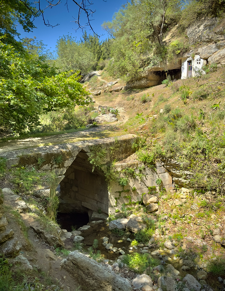 Ancient rock-cut early Christian tombs, including one that resembled a sort of low-rent hobbit hole with a modern coat of white-plaster and a glass-window, loomed over the dry creek bed. On the other bank, I could see moldering ancient stone walls, perhaps the remains of a quarry, or a mill. The scent of flowers, herbs, and chlorophyll hung in the warm and silent air, and I wondered where the bridge was for a moment - until I realized that I was, in fact, standing on it.