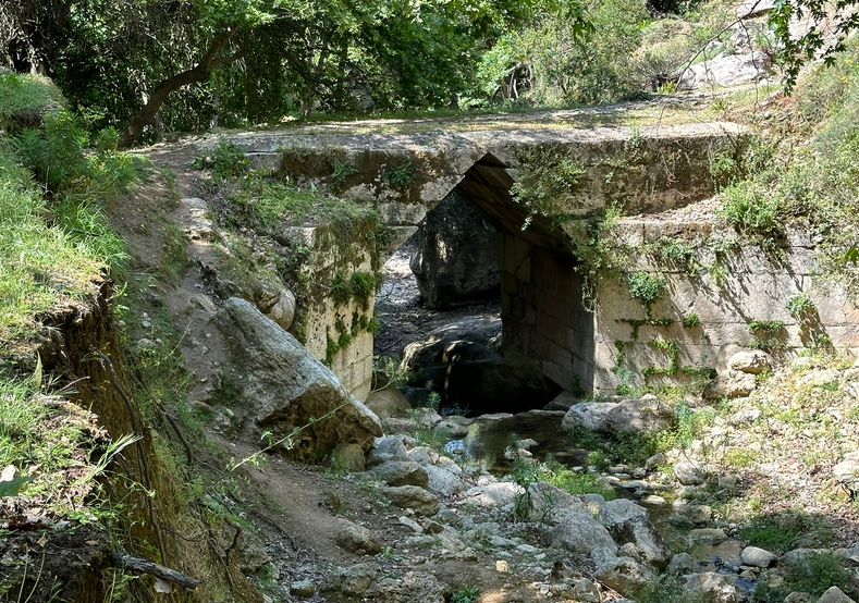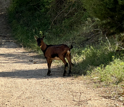 After walking through Orthi Petra, I decided to walk the half mile or so to another one of Eleutherna's ancient treasures: an ancient corbel bridge that likely dates back to Crete's Hellenistic period, and still stands today. With an occasional glance at my route in the AllTrails app, I walked along an unpaved path and found myself catching up with a group of goat herders moving in the other direction, and a shepherd gently throttling a young brown goat that had wandered off from the rest of the herd in the wrong direction.