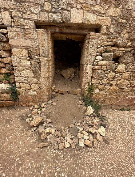 Finally, I walked up the path towards the crumbling remains of the tower-fort that sits at the crest of the hill, commanding an impressive view all over the ridges and canyons of the immediate area, and which . In front of the tower, I could see checker-boarded lines, inscribed in the dirt: archeologists think they might have been a low-budget way to emulate tiled marble flooring.