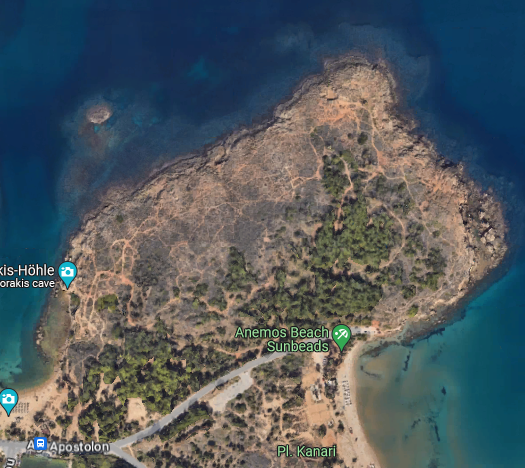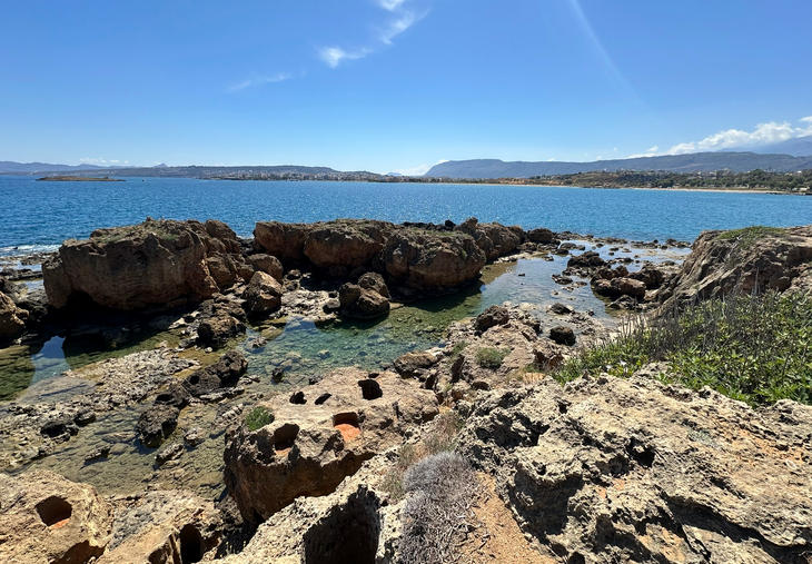 Walking the Coast Near Anemos Beach in Chania. At the end of Anemos Beach in Chania, you'll find trails criss-crossing a lovely, rocky promontory overlooking the sea, alternating between a truly surreal-looking volcanic coastline, and lovely stands of pine trees. It's not exactly marked well on Google Maps, but it's in this area: