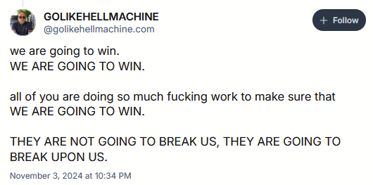 I have taken immense solace in @golikehellmachine's THEY ARE NOT GOING TO BREAK US, THEY ARE GOING TO BREAK UPON US mantra on Bluesky. I do believe that the majority of the American people are tired of miserable MAGA assholes, from those with immense and totally un-deserved power like Elon Musk (a person who I loathe to an extent that I am genuinely impressed is possible), to the lower-level flavor of local MAGA asshole that owns a car dealership and bullies innocent people for wearing masks to grocery store.