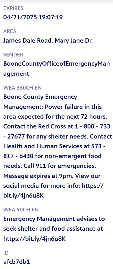 Here's one example: on April 21st of this year, authorities from the Boone County, Missouri Office of Emergency Management sent out a WEA message alerting locals to a power outage from local storms, which included a link to a non-verified Twitter page for further information: