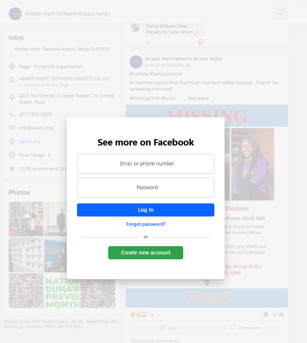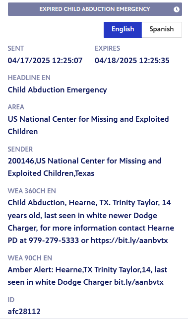 In April, authorities in Hearne, Texas sent out an AMBER alert WEA that linked out a Facebook page for the Amber Alert Network Brazos Valley while encouraging residents to send in information about a child abduction event.