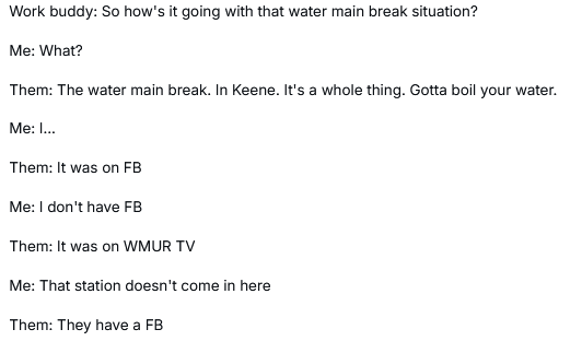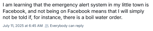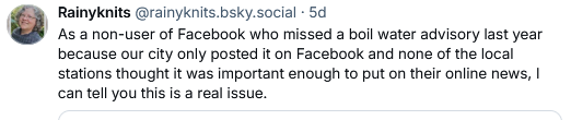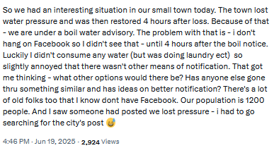 Take the example of this Bluesky user in New Hampshire, who discovered too late that their small town only communicated a boil water order via Facebook and local cable TV: