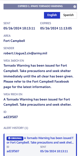 Even the U.S. military relies on Facebook for disaster communications sometimes, like in the below example from May, 2024 in which authorities at Fort Campbell in Kentucky sent out a tornado warning WEA and referred receivers to the installation's Facebook page for "the latest information":