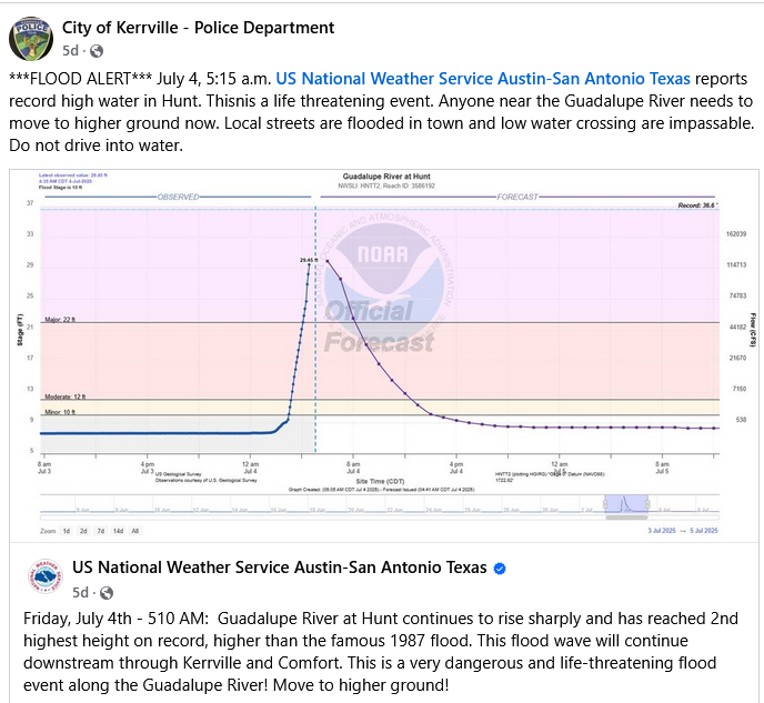 While the National Weather Service had been issuing warnings across multiple platforms about the prospect of flash flooding in the area since the afternoon of July 3rd, local officials in Kerrville appear to have waited until 5:16 a.m. on Friday to start doing the same.